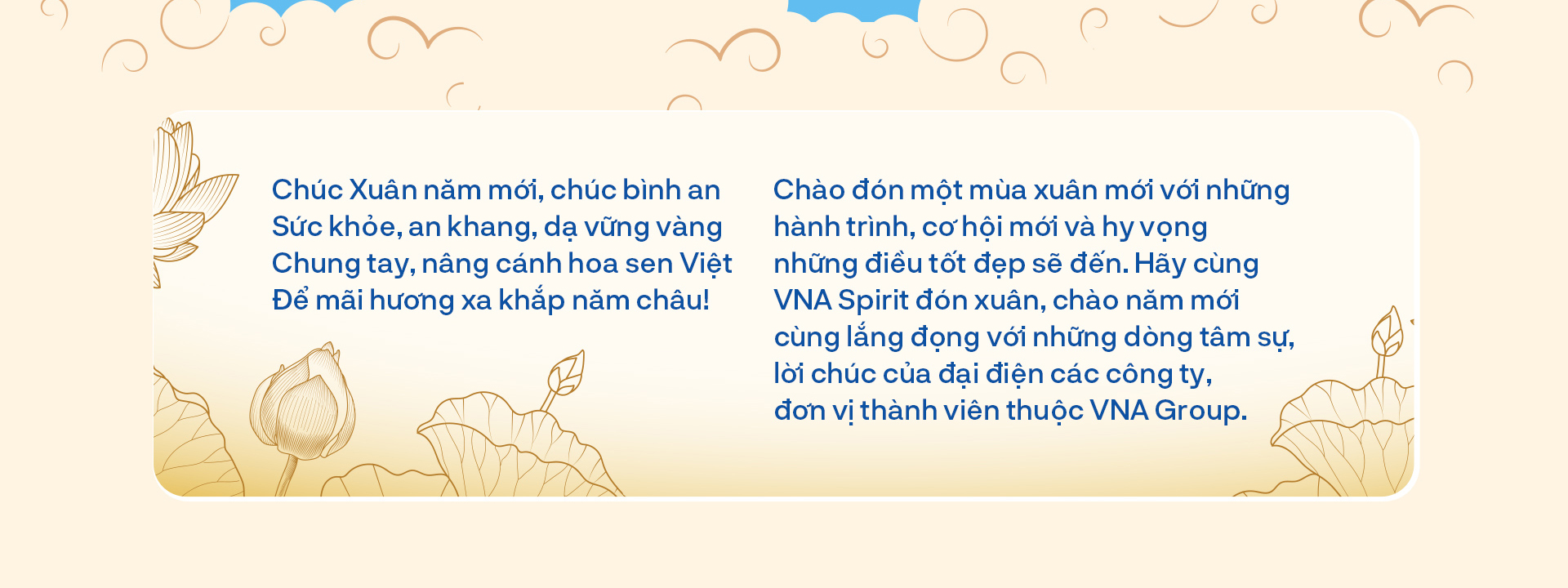 Chào đón một mùa xuân mới với những hành trình, cơ hội mới và hy vọng những điều tốt đẹp sẽ đến. Hãy cùng VNA Spirit đón xuân, chào năm mới cùng lắng đọng với những dòng tâm sự, lời chúc của đại điện các công ty, đơn vị thành viên thuộc VNA Group.